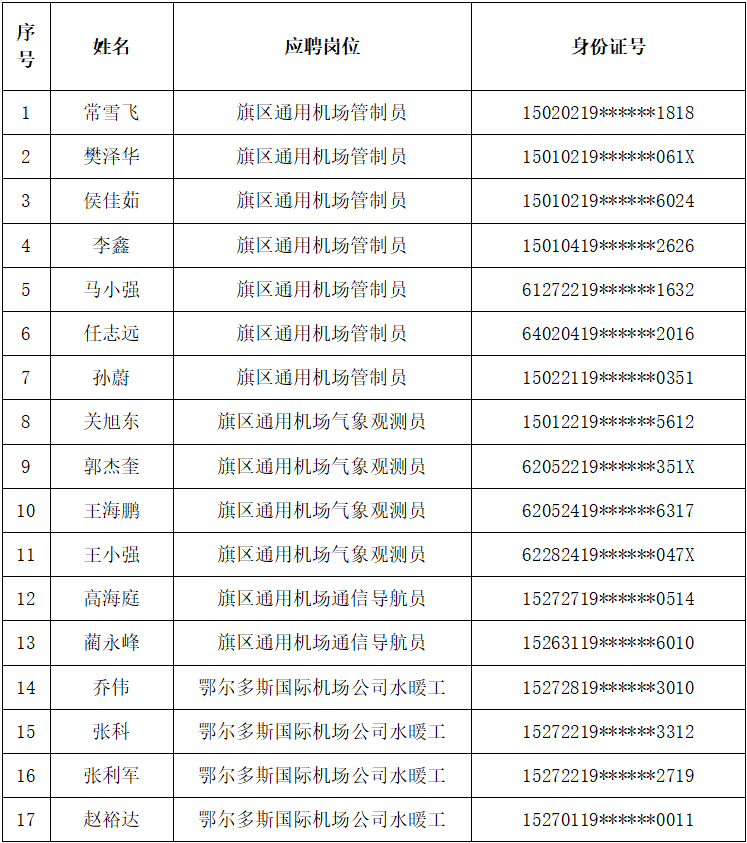 各位應聘者: 根據(jù)《鄂爾多斯伊金霍洛國際機場公司、旗區(qū)通用機場公司公開招聘工作人員的公告》要求,現(xiàn)將鄂爾多斯伊金霍洛國際機場公司、旗區(qū)通用機場公司公開招聘工作人員資格審查通過人員名單公告如下: 考試及后續(xù)相關工作安排均將通過鄂爾多斯機場管理集團有限公司官網(wǎng)公布,請考生隨時予以關注。 咨詢電話:0477—3855882 特此公告。