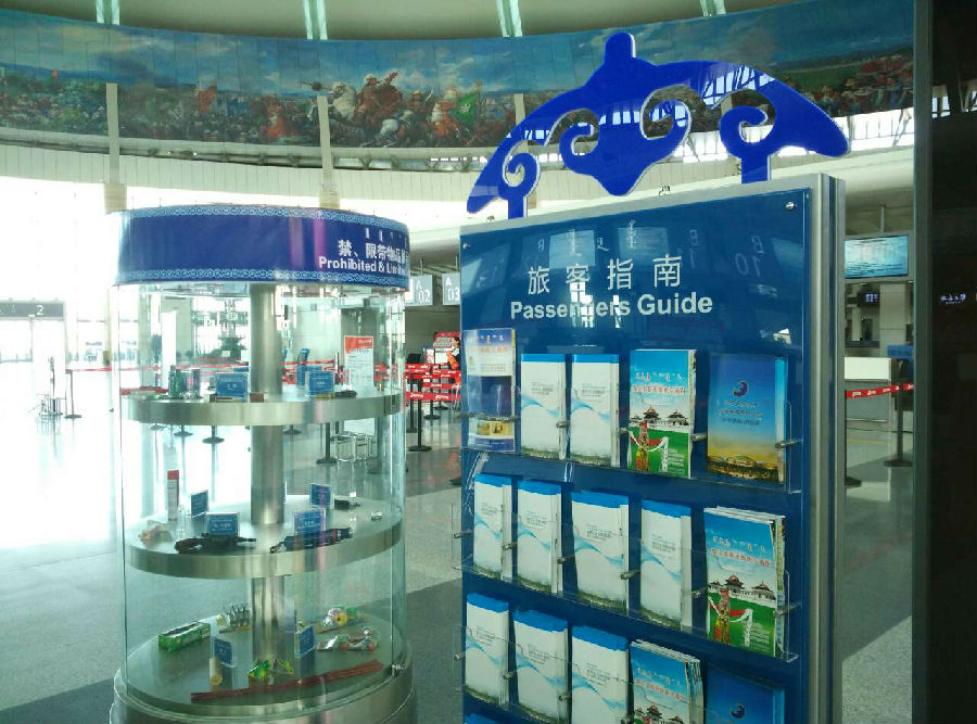 鄂爾多斯機(jī)場(chǎng)出港大廳和行李提取大廳各安裝兩個(gè)旅客指南展示架,上面擺放有鄂爾多斯旅游交通地圖、航班時(shí)刻表、服務(wù)指南等貼心卡片等,極大的方便了旅客的出行需求。